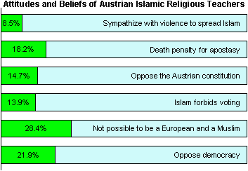 Apart from the above assertion, there is additional explosive data: 14.7% distance themselves from the Austrian constitution, 13.9% are of the opinion that elections are not compatible with Islam, and 28.4% believe that it is not possible to be a European and Muslim at the same time.